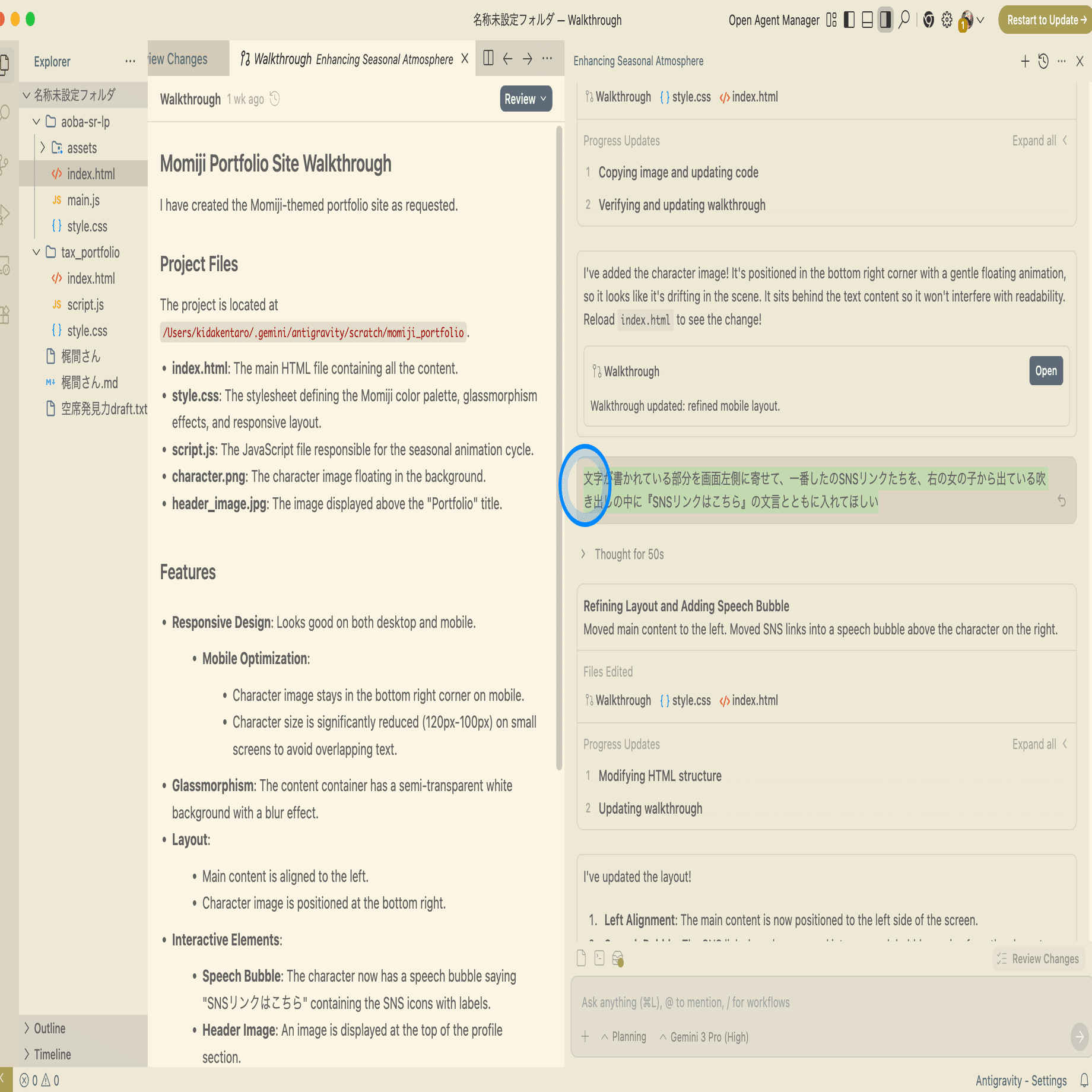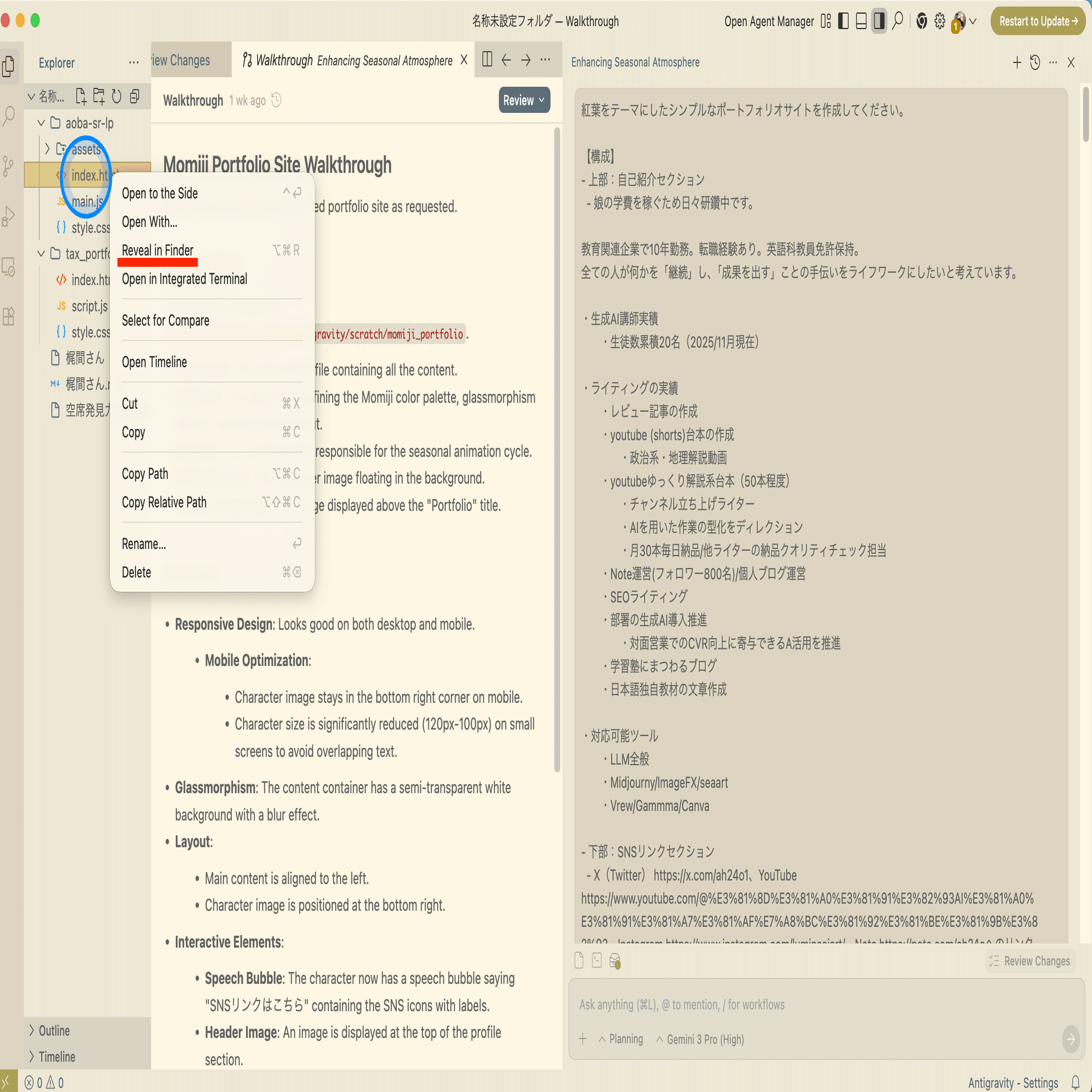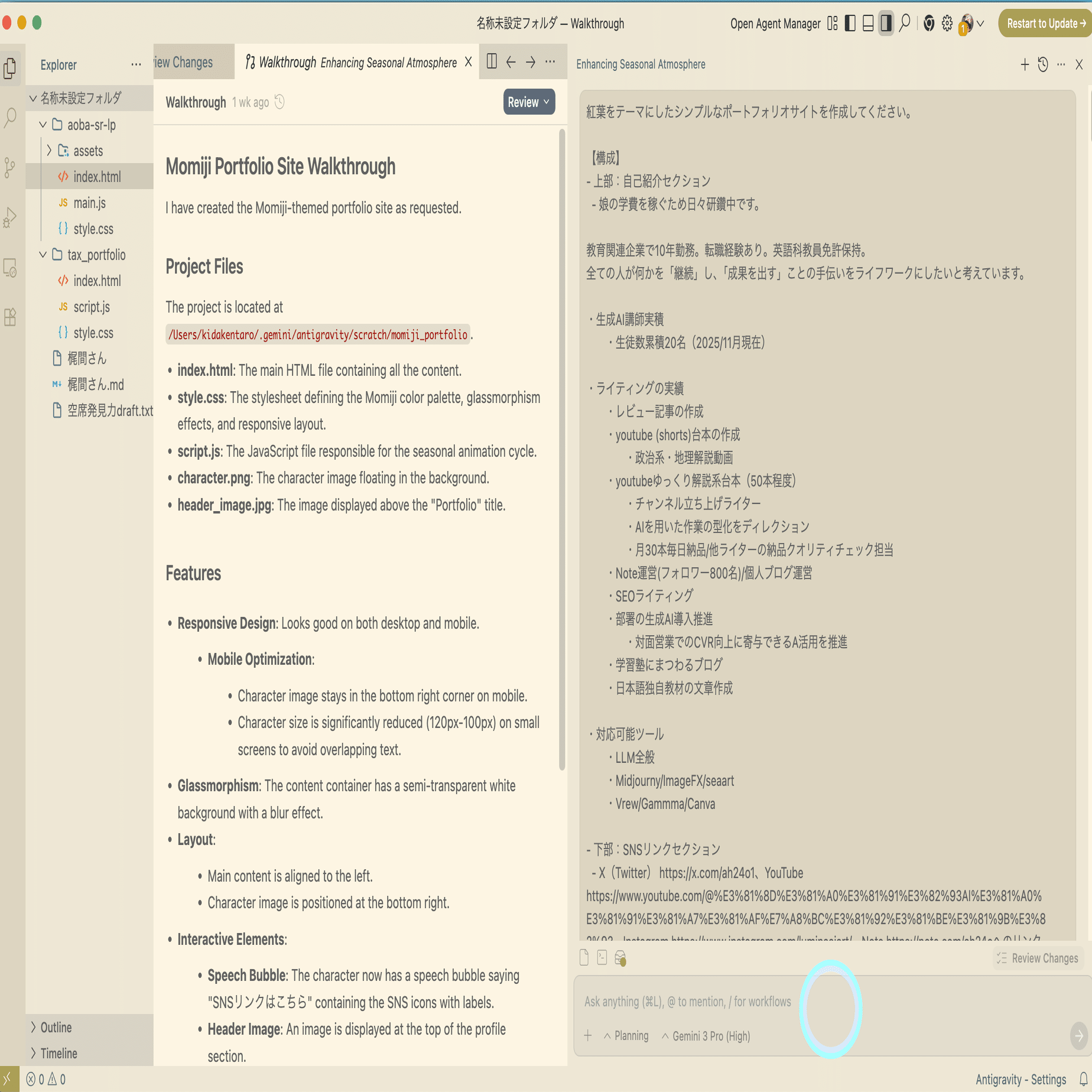 - Antigravityに指示を出すだけでサイトのコードが生成される
