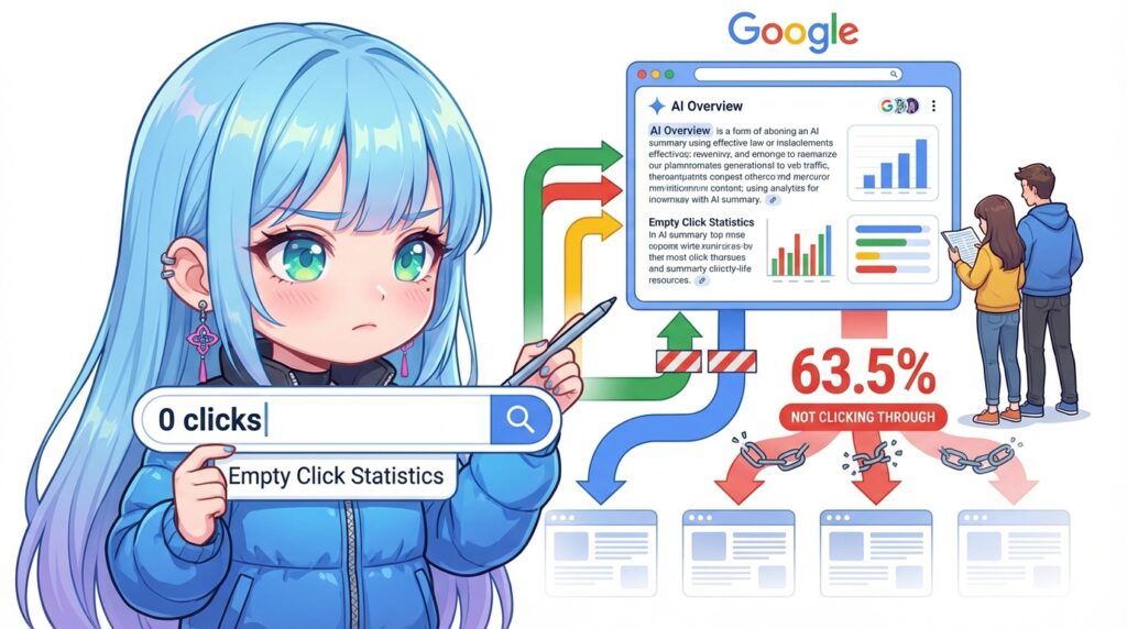 GoogleのAI Overviews(AIによる概要)やAIモードの機能により、検索結果の画面でAIが要約を表示してくれるから、ユーザーは「ああ、これで十分だわ」って満足しちゃって、元の記事にはアクセスしないんですね。