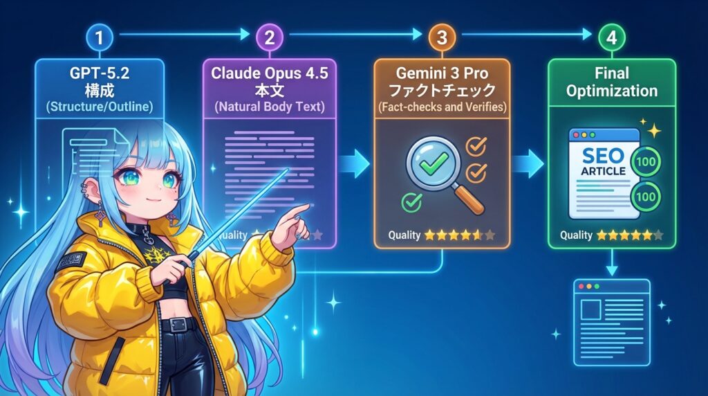 今まで僕がやってたのって、ChatGPTで構成作って、Claude開いて本文書かせて、Geminiでファクトチェックして…っていう3タブ体制だったんですよ。