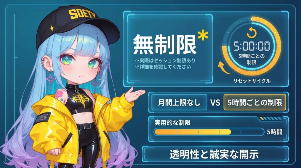仮に制限に達しても、5時間後には完全リセット。何回でもリセットされるので、実質的には気にしなくていいレベルです。