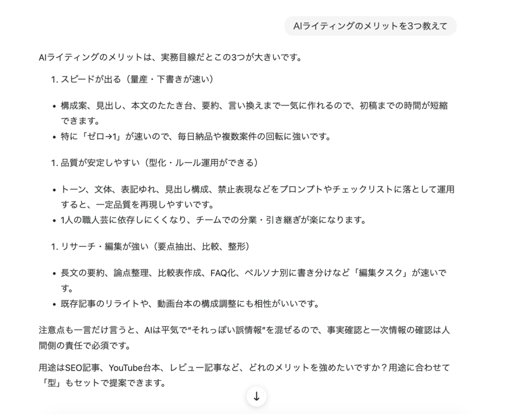 「AIライティングのメリットを3つ教えて」って聞いたときの回答の雰囲気がそれぞれ違うんですよね。