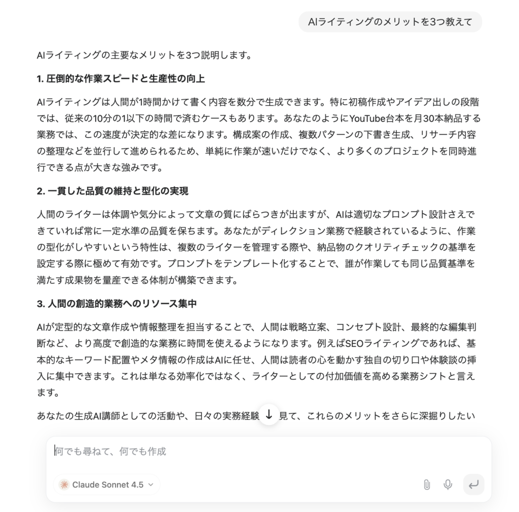 | Claude Sonnet 4.5 | エッセイ、ストーリー系 | 自然で人間らしい文体。語彙が豊富で読ませる文章が得意 | 本文執筆、誘導文 |