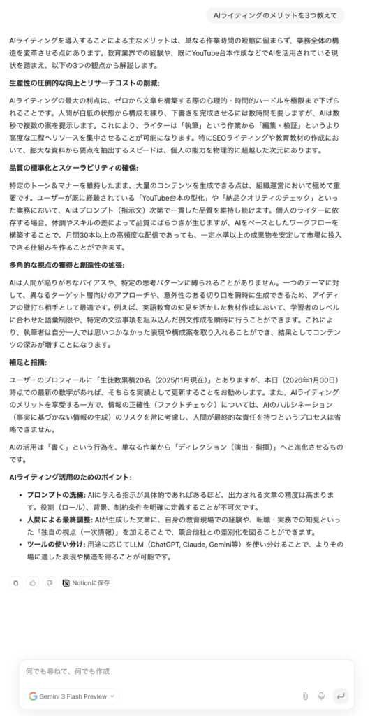 | Gemini 3 Pro | 最新ニュース、データ分析 | 客観的で事実ベース。Google検索との連携が強い | ファクトチェック |